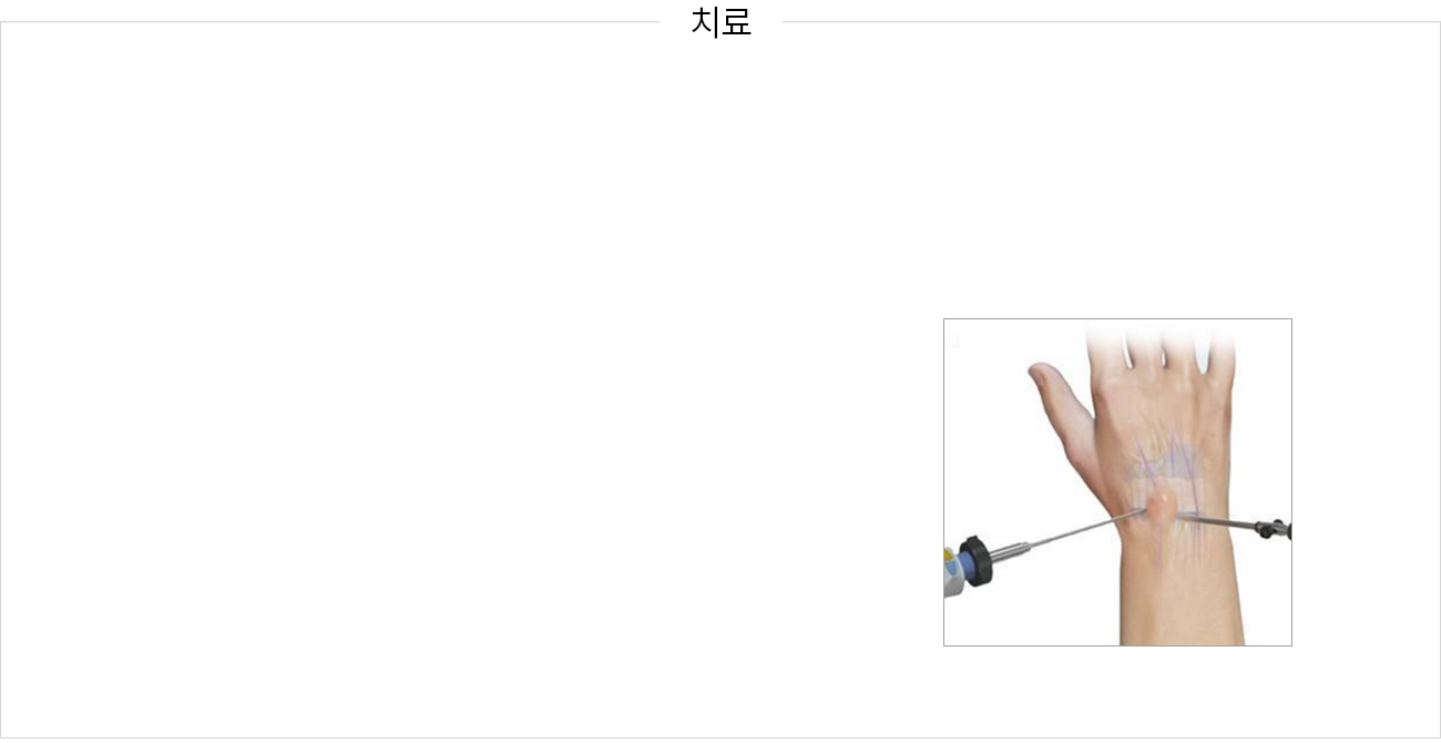 결절종은 종종 자연 소실되기도 하지만 주사기로 낭종 내 액체를 흡입하기도 합니다.