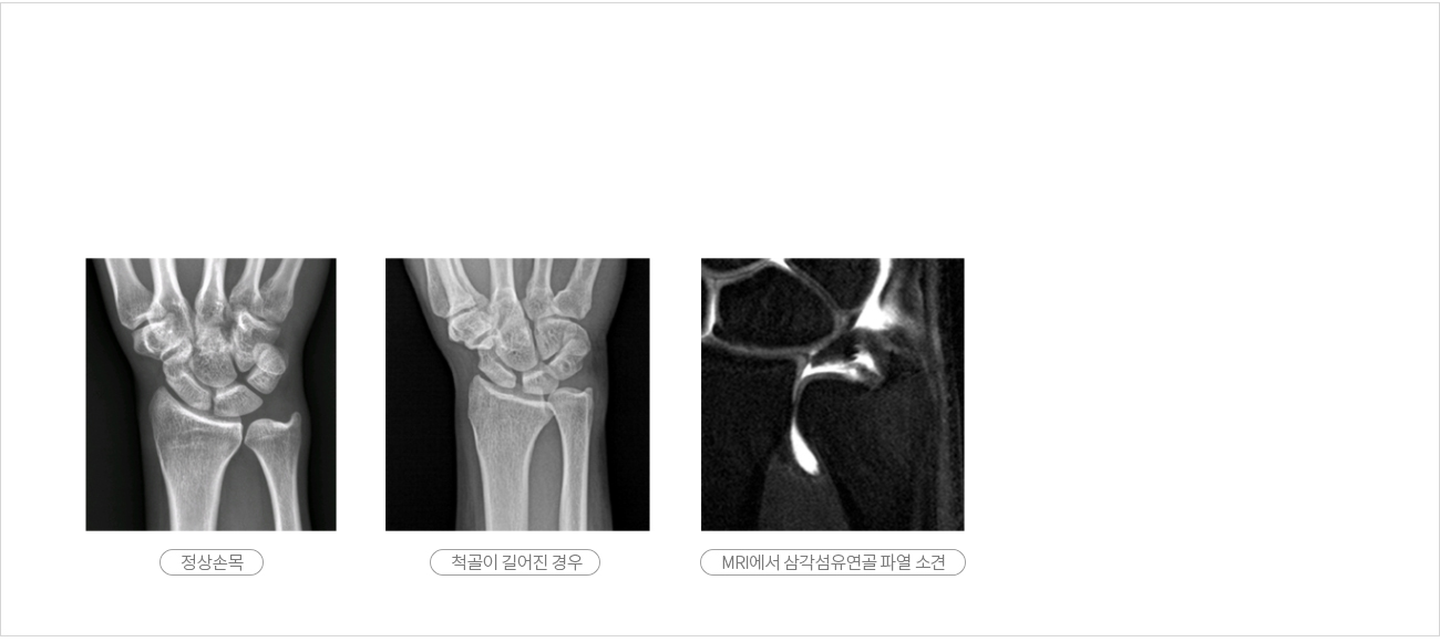 MRI 상에서 인접 부위 손상 여부와 삼각섬유연골(TFCC)파열을 관찰할 수 있습니다.