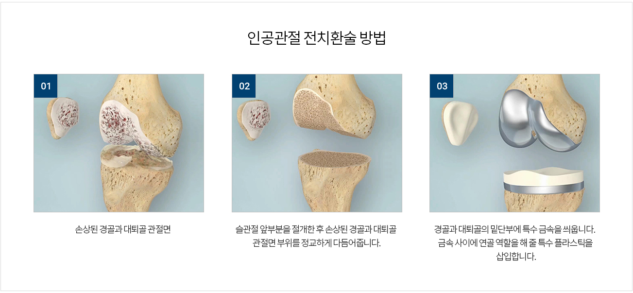 손상 부위를 제거하고 특수 제작된 인공관절을 대체해주는 수술방법입니다.