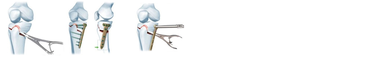 3. 이 상태에서 금속판과 나사로 고정하여 미리 계획한 대로 1자형 혹은 X 자형 다리를 만들고 빈 공간에 뼈를 이식하여 골유합을 유도합니다.