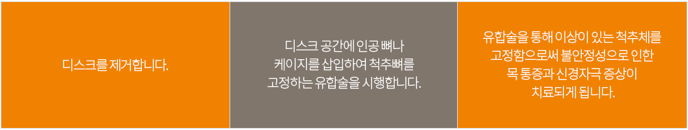 통증이 지속되거나 마비 증상이 발생하는 경우 신경을 누르고 있는 디스크와 뼈를 제거하고 디스크 공간에 인공뼈나