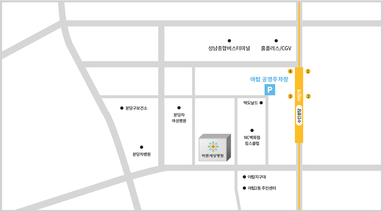 - · 병원 주차공간이 협소하므로 가능한 대중교통을 이용해 주시고, 개인차량을 이용하실 경우 인근 야탑 공영주차장을 이용해주시기 바랍니다.