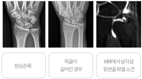 · MRI 상에서 인접 부위 손상 여부와 삼각섬유연골 (TFCC)파열을 관찰할 수 있습니다