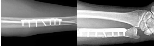 아래 사진은 고식적 방법의 척골 단축술이며 국내 또는 국외에서 많이 시행되고 있는 방법입니다. 4mm 이상의 뼈를 단축할 수 있고, 장점이 많으며 좋은 결과를 보고하고 있으나, 절개부위가 크며 절골술 부위의 불유합이 발생할 수 있다는 단점이 있습니다.