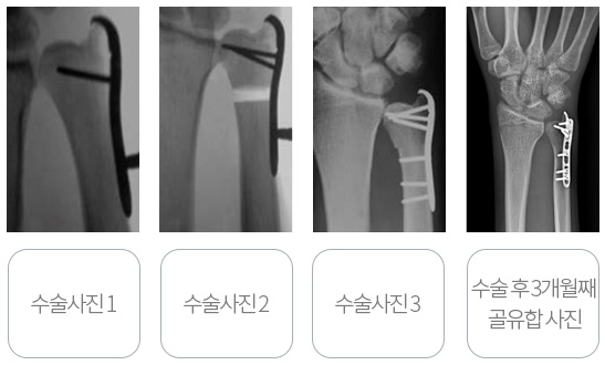 수술시 관절내시경을 통하여 연골상태를 확인하고 삼각섬유연골 파열이 있을 시 봉합술을 같이 시행한 뒤, 척골의 길이를 단축하는 척골단축술을 시행합니다. 단축할 길이가 2mm이하라면 관절내시경(Wafer 술식) 만으로 치료가 가능하나, 2mm이상이라면 관절내시경 만으로는 결과가 좋지 않으며, 통증이 남고 재발하는 경우가 흔합니다. 이때에는 금속판을 이용한 척골 단축술을 시행하여 많은 환자에서 좋은 결과를 보이고 있습니다.