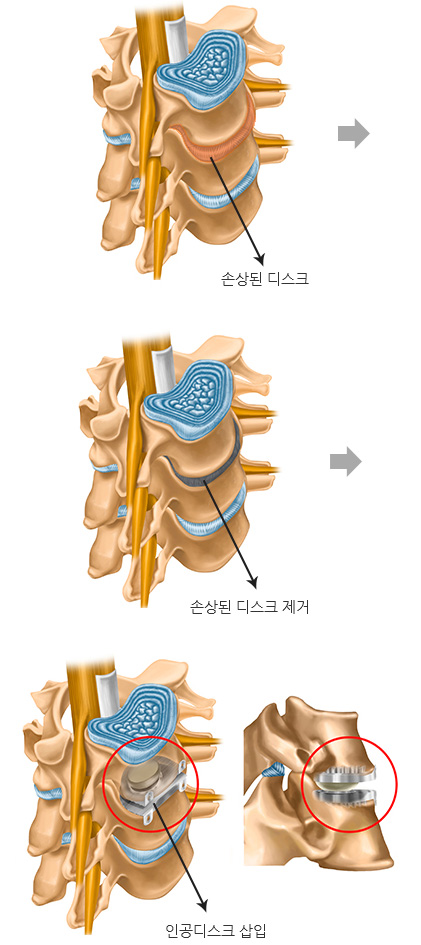 인공디스크는 제 기능을 하지 못하는 디스크를 제거하고 특수 제작된 인공디스크를 삽입하여 목의 운동이 원활하도록 하는 수술법입니다. 디스크 변성으로 인한 증상을 치료하는데 적용 되어집니다.