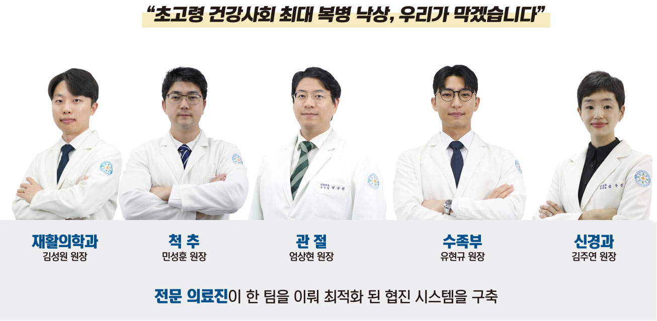 또한, 척추 • 관절 • 수족부 • 재활의학과 • 신경과 전문 의료진이 한 팀을 이뤄 최적화된 협진 시스템을 구축하고 있습니다.